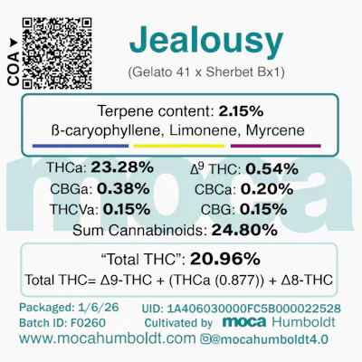MOCA HUMBOLDT presents JEALOUSY in a convenient 3.5g pre-pack of premium flower. This sought-after strain delivers a complex flavor profile blending gassy, earthy notes with sweet, creamy undertones and hints of citrus that tantalize the palate. JEALOUSY is celebrated for its potent effects that inspire creativity and euphoria while promoting deep relaxation—perfect for unwinding after a long day or sparking your next artistic endeavor. The dense, frosty buds showcase vibrant purple hues and a generous coating of trichomes, reflecting the quality and care MOCA HUMBOLDT brings to every harvest. Whether you're a seasoned enthusiast or exploring new strains, this pre-packed flower offers exceptional value and consistency in every session.