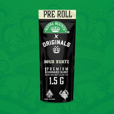 Royal Blunt's Collab line with Original Family Farms, 1G Blunts with glass tip, featuring Sour Runtz; An indica Dominant Hybrid Strain created through crossing the Potent Sour Diesel and the Fruity Runtz Strains. Notes of Citrus, Honey, Sour, Sweet, and Tropical. effects noted include a Calming, Euphoria, Relaxing, Uplifting Body High.