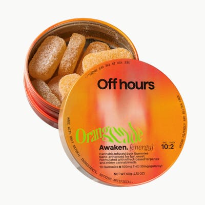 Ready to wake up? Off Hours Awaken Orange Punch gummies are specially formulated with an eye-opening blend of terpenes, THC and THCV to energize your day.