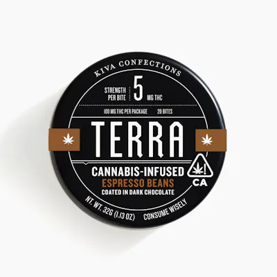 "Espresso Terra Bites are crafted from micro-roasted Tanzanian coffee beans coated in premium dark chocolate. Each bite is polished to rich, earthy, irresistible, perfection. Ingredients: Semisweet Chocolate (Sugar, Unsweetened Chocolate, Cocoa Butter, Potassium Carbonate, Sunflower Lecithin, Vanilla), Espresso Bean, Gum Arabic, Cannabis Extract, Cocoa Powder, Confectioner's Glaze, Natural Flavor, Sucrose, Glucose Syrup."