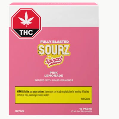 SOURZ by Spinach® Fully Blasted Pink Lemonade gummies have 10mg of THC per piece and the flavours of raspberry and lemonade! These dual-flavoured gummies are over-the-top with natural flavours and blasted with sour crystals. Enjoy 10 gummies with 10mg of THC per gummy and 100mg of THC per pack.