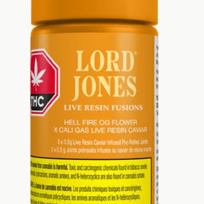 Lord Jones Live Resin Fusions are kief-coated and filled with high-potency, terpene-rich, live resin caviar and hard-hitting, single-strain flower sure to go beyond all expectations. With the Lord Jones Live Resin Fusions Hell Fire OG x Cali Gas, take yourself to the underworld of potency and flavour with a fusion of gassy and garlicy Cali Gas live resin caviar and Hell Fire OG flower. Finish strong with a dense pine aroma that fills the room with every exhale. With the addition of premium ceramic filters, your smoking experience is now smoother than ever.
