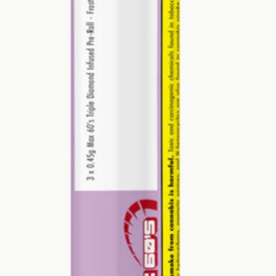 Step up your game with Max 60's Triple Diamond Infused Pre-rolls in Frosted Grape! These three 0.45g pre-rolls take potency to the next level with liquid diamonds and crushed diamonds on the inside, plus a solid diamond coating on the outside. Enhanced with premium botanical terpenes, they deliver a sweet, rich, and minty grape flavour that’s both refreshing and bold. Featuring a powerful 60–65% THC, Max 60’s Frosted Grape pre-rolls are as satisfying as they are strong.