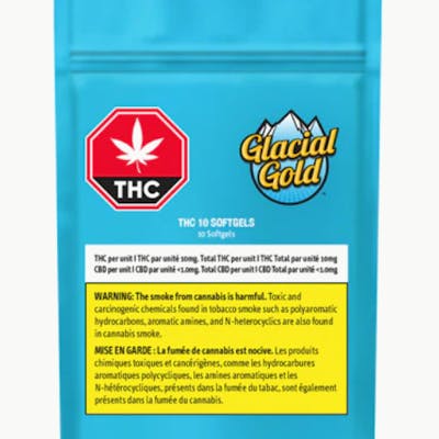 Glacial Gold THC 10 Softgels feature 10mg of premium THC mixed with organic MCT oil derived from coconuts. Available in a ten-pack providing 100mg total THC per package.