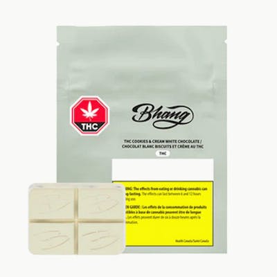 Bhang® THC Cookies and Cream White Chocolate pairs gourmet white chocolate and 10mg of THC, scored into four pieces. It has a cannabis-free flavour of white chocolate and crunchy cookie bits.