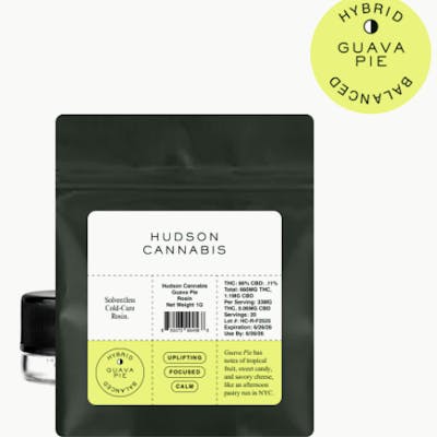 Hudson Cannabis | Guava Pie Cold Cure Rosin Concentrate Hudson Cannabis presents Guava Pie Cold Cure Rosin—a premium Hybrid concentrate crafted for discerning consumers who seek a solventless, full-spectrum experience. Pressed from fresh-frozen flower and cured at low temperatures, this cold cure rosin preserves the strain's natural terpenes and cannabinoids, offering a smooth, flavorful, and potent dab every time. Expect a balanced aroma of tropical fruit and creamy baked notes, with a nuanced high that combines an uplifting cerebral buzz with calming body effects. The cold cure process enhances flavor stability and smoothness, making it ideal for low-temp dabbing and terpene-rich sessions. Key Features: Solventless Cold Cure Rosin for full-spectrum purity Pressed from fresh-frozen Hybrid flower Flavor profile blends guava, cream, and earthy undertones Balanced effects: euphoric head high with soothing body calm Ideal for low-temperature dabbing and terpene preservation Strain Type: Hybrid Flavor Profile: Guava, Cream, Earthy Effects: Euphoric, Balanced, Relaxing