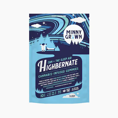 10 Count 10mg CBN | 5mg THC per gummy 100mg CBN | 50mg THC per package There is nothing like a good nights slumber under the stars. But sometimes it’s not that easy to shut down the old noggin. That’s why Minny Grown’s Highbernate is here. A combination of 10mg of CBN (cannabinol) and 5mg of THC, this product is our best solution for getting a great nights sleep .