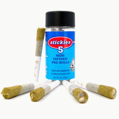 Discover Sativa infused mini pre-rolls by Stickies™. Stickies are not your average pre-rolls. Each single or 5-pack is a handcrafted powerhouse—painted with potent cannabis oil, then coated in terp-heavy bubble hash. Delivering potent effects with bold flavor in every puff.