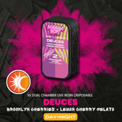 Sativa x Indica Immerse yourself in the vibrant streets of Brooklyn with our Brooklyn Cherries and Lemon Cherry Gelato duo, meticulously curated for Day + Night enjoyment in our innovative dual-chamber tank, Deuces. Experience the bold cherry flavor of Brooklyn Cherries, reminiscent of bustling streets and lively neighborhoods, complemented by the refreshing twist of Lemon Cherry Gelato's zesty lemon and sweet cherry blend. Operating Deuces is as easy as a tap. Three lights - Red, Blue, and Red/Blue - signify the flavor of each side. Tap once to seamlessly switch between flavors - because why settle for two flavors when you can have three?