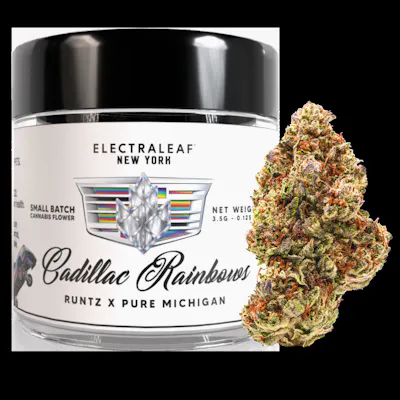 Cadillac Rainbows, also known as “Cadillac Rainbow,” “Cadillac Rainbowz” or “Rainbow Cadillac,” is an indica dominant hybrid strain created through crossing the potent Pure Michigan X Runtz strains. Named for its gorgeous appearance and heavy stench, Cadillac Rainbows is the perfect tasty treat to help you settle down after a stressful day. This bud has eye-catching oversized and fluffy, conical dark olive green nugs adorned with vibrantly purple undertones, thin reddish-orange hairs and a frosty coating of sparkling, chunky blue-tinted white crystal trichomes. As you break apart each rainbow little nugget, you'll experience aromas of pungent diesel accented by sweet, citrusy lemon and fruity cherries dancing through the air. The flavor is even sweeter, with a sugary cherry taste accented by sour, lemony candies and fresh flowery herbs.