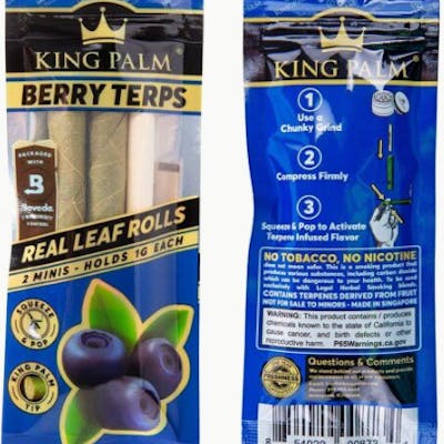 King Palm – 2pk Mini Berry Terps Flavored Wraps Activate The Flavor Any Time. Simply Squeeze & Pop The Corn Husk Filter On The Top & Bottom. All fusion rolls must be popped twice, squeeze and pop at the tip of the filter to activate one flavor, then squeeze and pop at the top of the filter to activate the other flavor creating a great fusion effect. – This display comes with 20 pouches containing 2 Mini Size pre-rolls in each. Each individual Mini Size roll has a capacity of up to 1 gram. These slim counter displays are a great value for you, give your customers a little taste of King Palm Wraps to keep them wanting more. Add a pouch on to any dry herb or lighter sale! Features: 2 Mini Pre-Rolls per Pouch Packing Stick 100% Real Palm Leaf Organic, Non-GMO Corn Husk Filter Tobacco & Chemical Free Slow Burning