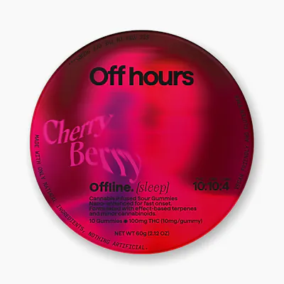 Off Hours Cherry Berry flavored gummies are specially formulated with the perfect combination of THC, CBN, and CBD to send you fast asleep. Sweet dreams. Nano-enhanced cannabinoids for fast onset. Ten 10mg Gummies | 10mg THC : 10mg CBD : 4mg CBN per piece | 100mg THC : 100mg CBD : 40mg CBN per package | Cherry Berry | Indica Gluten Free • Dairy Free • Vegan • Tree Nut Free • Coconut Free Ingredients: organic cane sugar, reverse osmosis water, organic tapioca syrup, organic fruit juice from concentrate, fruit pectin, organic fruit flavoring, natural food coloring, MCT oil, cannabis extract, soy extract, terpenes Gummies are a form of edible cannabis, typically made with cannabis extract or oil. They are chewable and ingestible. A ratio defines how many mg of one cannabinoid there are against another cannabinoid in a single dose. The cannabinoid ratio in this product is for THC to CBD to CBN.