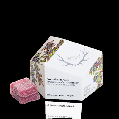 Wyld Huckleberry Hybrid gummies are made with real fruit and enhanced with a balanced hybrid terpene profile that assists in creating a sense of cheerfulness and overall well-being. Ideal for your day-to-day adventures! --- Ten 10mg THC Gummies | 100mg per package | Hybrid Gluten Free • Dairy Free • Soy Free --- Gummies are a form of edible cannabis, typically made with cannabis extract or oil. They are chewable and ingestible.