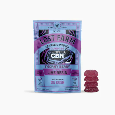 Dominated by the distinct flavors of black raspberry, this bright, crisp chew also features a sharp gooseberry finish to balance out the savory scents of OG Kush live resin. OG Kush is an indica-dominant hybrid that's great for supporting sleep due to its relaxing, sedative effects- which are boosted by CBN. It's defined by complex aromas of earthy wood and skunky fuel on a sour citrus pine background. Ingredients: Sugar, Tapioca Syrup, Hydrogenated Palm Kernel Oil, Freeze Dried Acai Powder, Citric Acid, Natural Berry Flavor WONF, Fruit and Vegetable Juice for Color, Agar, Mono- and Diglycerides, Sodium Citrate, Potato Starch, Soy Lecithin, Cannabis Extract, Corn Starch. Ten gummies | 10mg THC 10mg CBN per serving | 100mg THC 100mg CBN per package | Indica | Infused Gummies are a form of edible cannabis, typically made with cannabis extract or oil. They are chewable and ingestible.
