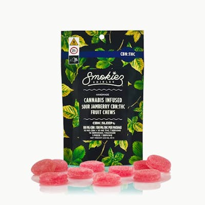Smokiez Sour Jamberry CBN:THC 1:1 Fruit Chews are NOT YOUR AVERAGE FRUIT CHEWS™ ;) These delicious fruit chews are a tasty and discreet way for you to medicate! They are also Vegan, Gluten Free, Dairy-Free, and contain NO High Fructose Corn Syrup. Each of our mouth watering fruit chews contain 10 mg of CBN and 10 mg of THC, and made with our high clarity cannabis distillate for great taste. There is 10 pieces per package with 100mg CBN + 100 mg active THC per package. SO... WHAT IS CBN? Cannabidol (CBN) is the most sedative-known cannabinoid, making it ideal for a good night's sleep. Ten 10mg Gummies | 10mg THC per piece | 100mg THC per package | Indica Gluten Free • Dairy Free • Vegan Gummies are a form of edible cannabis, typically made with cannabis extract or oil. They are chewable and ingestible
