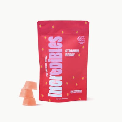 Berry chill. Sunshiney days, fresh-picked strawberries, and nothing on the agenda. Kick up your feet and say it with us, "ahhh." incredibles Strahhhberry CBD 1:1 gummies offer 100mg THC total and 100mg CBD, with 10mg THC and 10mg CBD per gummy. Made with 100% pure cannabis oil in a perfectly blended mixture to ensure accurate dosing and consistency. 10 Gummies | 10mg THC | 10mg CBD | Strahhhberry Gummies are a form of edible cannabis typically made with cannabis extract or oil. Gummies are chewable and ingestible. A ratio defines how many mg of one cannabinoid there are against another cannabinoid in a single dose.