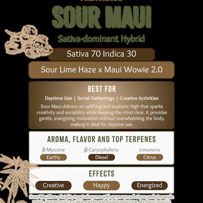 Sour Maui is a cultivar of unconfirmed origins thought to be a combination of Sour Diesel and Maui Wowie.