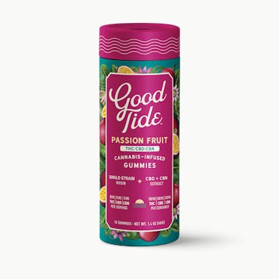 Take your mellow to the next level with Good Tide Passion Fruit THC:CBD:CBN gummies. An Indica single-strain rosin is enhanced with an extra dose of CBN and CBD’s relaxing properties and the tropical delight of passion fruit flavor to help you sway into the perfect hammock nap. Sleep | 10mg THC:CBD:CBN per gummy, 100mg THC:CBD:CBN per package. Made with fully compostable packaging.