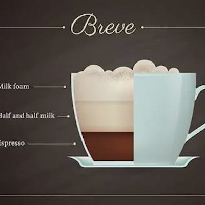 A breve is a coffee drink made with espresso and steamed half-and-half in a 1:1 ratio, resulting in a creamy and smooth texture. It is often served in a small glass and is sometimes referred to as a breve latte or caffè breve. The term "breve" comes from the Italian word for "short," indicating the short shot of espresso used as the base.
