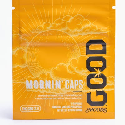 POP âN SHINE. Brighten your morning routine with GOOD Morninâ. Our special combo of THC, CBG, and functional terpenes will add a lil pep to your AM step. A perfect option for your sunrise ritual. 10mgTHC, 5mg CBG per capsule.Our capsule encasings are all-natural, vegetarian, gluten-free, preservative-free.