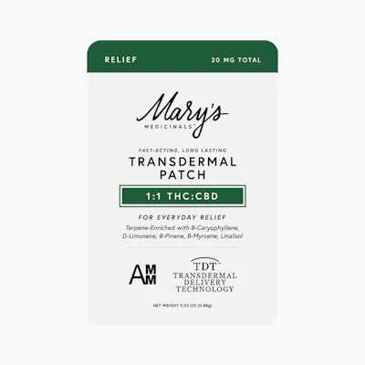 Our Relief Transdermal Patch, with a 1:1 CBD:THC ratio, is designed to promote relief from common aches and pains in your daily life. Our Everyday Relief products are formulated with natural ingredients that provide systemic relief from daily stressors. Winner of the 2023 Michigan and SoCal High Times Cups, Mary’s Medicinals Relief Transdermal Patch is sure to be a winner in your book as well. Mary’s award-winning transdermal patches come from our commitment to accurate dosing through an advanced delivery method. The discreet 2x2” squares simply adhere to any veinous parts of the skin like the inner wrist of top of the foot for 8-12 hours of effect. Heat, sweat and water-resistant, Mary’s patches can be simply and accurately micro-dosed by cutting them down.