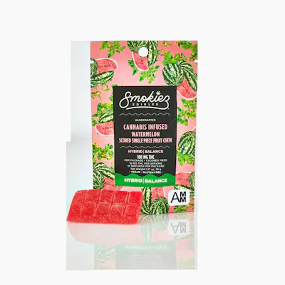 Smokiez Hybrid Watermelon Fruit Chews are NOT YOUR AVERAGE FRUIT CHEWS™ ;) These fruit chews taste like a ripe and juicy watermelon, with a pleasant balance of sweetness and fruity notes. Scored for easy dosing! Each of these fruit chews are divided into 10 scored servings. These delicious fruit chews are a tasty and discreet way for you to medicate! Each piece contains 10mg of THC, and made with our high clarity cannabis distillate for great taste. There is 100mg active THC per package. Each serving contains 10mg of THC. They are also vegan, gluten-free, and contain NO high fructose corn syrup. Available in both sweets & sours.