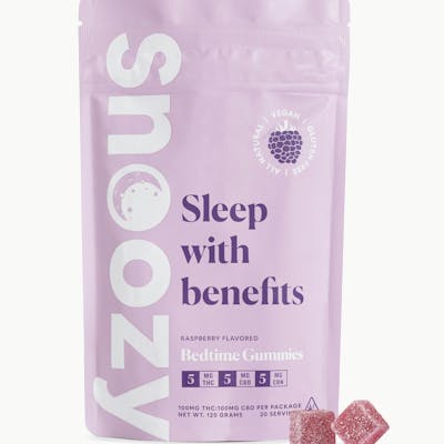 Nighthawks and early birds have one thing in common - good and consistent rest is important to overall health. Snoozy THC Gummies for Sleep help you get the rest you need when you can’t sleep. Each Snoozy gummy contains cannabinoids such as Delta 9 THC, CBD, and CBN, combined with all-natural chamomile and L-theanine to promote restful sleep. Formulated with Organic & All Natural ingredients to help you get the rest you deserve. Serving Size: 20 All Natural Vegan Gluten Free Active Ingredients: 100MG THC:100MG CBD PER PACKAGE - THC - 5mg | CBD - 5mg | CBN - 5mg - Chamomile - 10mg - L-theanine - 25mg