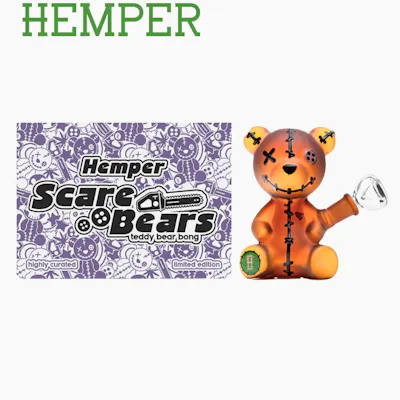 Add a touch of spooky charm to your setup with the Scare Bears Teddy Bear Bong in a compact, collectible size. Designed by HEMPER with the same durable, high-quality glass as its XL counterpart, this piece blends playful aesthetics with smooth, reliable performance. Its diffused downstem delivers clean, satisfying hits, while the teddy bear-shaped body makes it an eye-catching addition to any collection. Perfect for daily sessions or as a festive seasonal piece, the Teddy Bear Bong is part of this month’s exclusive Scare Bears Collection. Fun, functional, and full of character, it brings spooky-season energy to every smoke. Key Features: 5.7” Tall x 4” Wide x 3.1” Deep 45° Recessed 14mm Joint 14mm Clear Bowl included Diffused Downstem for smoother hits Frosted amber body Durable high-quality glass construction Compact, collectible Scare Bears design Perfect for fans of unique themed glass, the Teddy Bear Bong blends cute, creepy, and fully functional into a must-have seasonal piece. Add this Scare Bear to your collection before it’s gone.