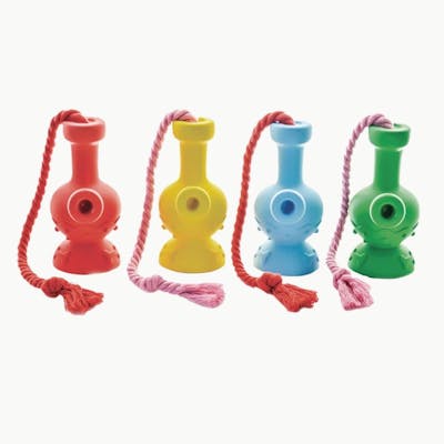 Ready to pup, pup, pass?! While you enjoy your pipe, let your pooch feel included! The Tug & Toke water pipe dog toy from Puff Palz is shaped like a bubble base water pipe with a tasty bone prints. Made from non-toxic rubber material, the toys have an attached rope for all canines and owners who love a game of tugs. Colours may vary from images. Puff Palz Features: Size: 6" Tall Bubble Base Bubbler Design Treat Holder Massaging Nubs Clean Teeth 100% Non-Toxic All-Natural Rubber Dishwasher Safe Colours Vary