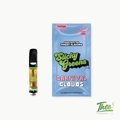 STICKY GREENS brings you CARNIVAL CLOUDS 1G, a premium sativa 510 thread cartridge designed to elevate your day with uplifting energy and creative focus. This 1-gram vape cartridge delivers smooth, flavorful vapor with each draw, perfect for those seeking an invigorating experience. Expect bright, euphoric effects that spark motivation and enhance your mood, making it ideal for daytime use, social gatherings, or creative pursuits. The convenient 510 threading ensures compatibility with most standard batteries, offering portability and ease of use wherever you go. CARNIVAL CLOUDS combines quality cannabis oil with a user-friendly design, delivering consistent potency and satisfying clouds. Whether you're new to vaping or a seasoned enthusiast, this sativa cartridge from STICKY GREENS provides an energizing boost that keeps you feeling uplifted and engaged throughout your day.
