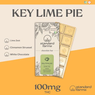 Key Lime Pie – 100mg – 10pc LIME ZEST CINNAMON STREUSEL WHITE CHOCOLATE The Story: Bright, creamy, and straight-up delicious. This bar nails that fresh key lime pie flavor with real lime zest oil for a citrusy pop and crunchy cinnamon streusel bits that taste just like graham cracker crust. It’s all wrapped in smooth white chocolate that’s rich without being too sweet. Every bite is a balance of citrus, cream, and crunch—like a cool, whipped-topped pie on a summer afternoon. 10mg per serving, 100mg per bar. 10 pieces of sublime white chocolate flavored with lime zest and sweet, crunchy crumbles of cinnamon streusel!