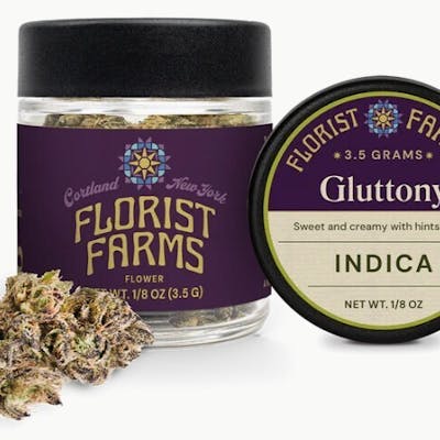 This eighth of Florist Farms flower is hand-trimmed and sustainably grown in greenhouses with living soil at their farm in Cortland, New York. Whether you're rolling up or packing a bowl, expect a smooth, consistent experience rooted in craftsmanship and integrity. Effect: Indica Flavor: Sweet and creamy with hints of gas Ingredients: 3.5 Grams of Cannabis Flower Users have reported a powerful calming body buzz that eases pain, and often leads to a boost in appetite. Gluttony is ideal for those seeking relief from discomfort and need to ease any woes in the evening time. THC: 23%