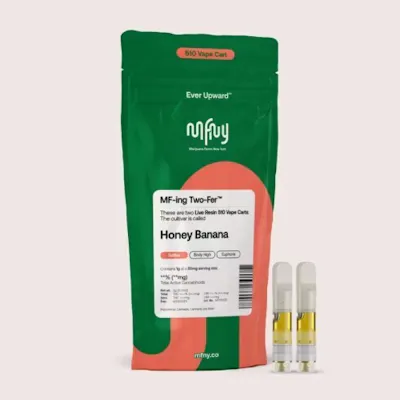 SATIVA MF-ing Two-Fer: We're now offering two 1/2g carts in one bag. Why? Pouring less oil into one cart means we can preserve more of the plant's full spectrum cannabinoids, remarkable natural terpenes and fuller flavor. Not only that, the Two-Fer is better value and more of our single- source, in-house produced Honey Banana real live resin: the unmistakable banana aroma of Strawberry Banana is well balanced with sweet flavor of Honey Boo; known to promote emotional balance and uplifted mood with long lasting, invigorating cerebral effects. For our real live resin we start with fresh-frozen flower buds, then use the hydrocarbon extraction method (plus years of experience and scientific precision) to delver the purest plant extract. No distillates, added flavors, or alterations. Comes in a 510 Cart with recommended battery settings 2.8 - 3.3V. Do not vaporize live resin at higher temperatures, as it can “burn off” the precious terpenes and aromas we are working hard to preserve; higher temps can also cause an undesirable “burnt” aftertaste. Vape cartridge contains concentrated live resin oil that is heated by a battery and vaporized for inhalation. These products are very potent and are designed to be consumed in 2-3 second puffs.