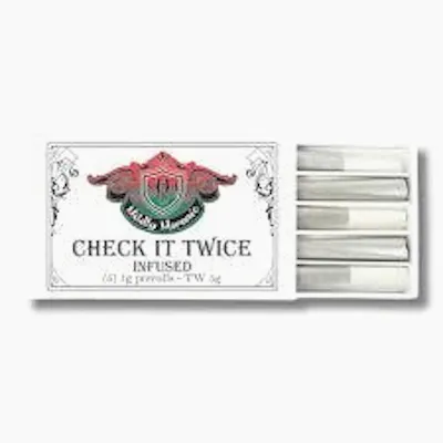 Check It Twice is a bold, flavorful hash-infused pre-roll pack crafted for elevated potency and smooth enjoyment. Each 1g pre-roll blends quality flower with rich hash infusion, delivering a slow, even burn and a terpene-forward experience.