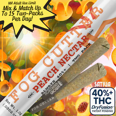 Sativa leaning Hybrid Include Two .5g Infused Pre-Rolls Juicy, vibrant, and bursting with sun-ripened flavor. Peach Nectar delivers a lively blend of fresh peach and apricot sweetness layered with tropical depth. Featuring Juicy Peach Rings and Apricot Sunray botanicals with Live Mango Trees terps, this Fog Cutter hits with bright stone-fruit flavor up front before finishing clean with a lightly tropical, uplifting edge. It’s crisp, refreshing, and dangerously smooth. About Fog Cutters: Cut through the haze with Fog Cutter Infused 2pk 0.5g Pre-Rolls. Each Fog Cutter pre-roll is infused with high-potency distillate extract and enhanced with a precise blend of natural and live terpenes, delivering bold flavors and amplified effects. Perfect to stretch out your sesh or share with a friend! What truly sets Fog Cutter apart isn’t just the exceptional quality - it’s that this level of craftsmanship. With THC levels starting at 40%, a centrifugal rolling process for perfect burns, and flavors inspired by the rugged beauty of the home we call New England, Fog Cutter is proof that you don’t have to overpay for a top-tier experience.