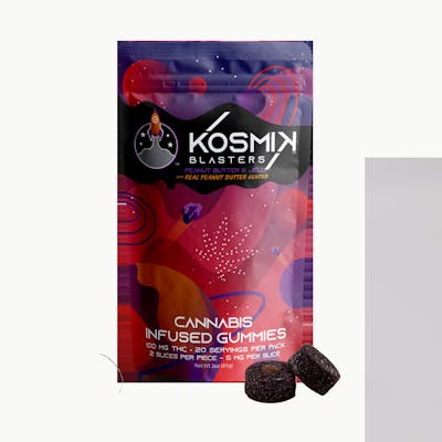 "Peanut Butter & Jelly w/ Real Peanut Butter 1st Place Winner NECANN Cup of Champions '24 2nd Place Winner NECANN Cup '24 1st Place Winner Croptober Fest '23 " Description: Kosmik Blaster gummies are amazingly juicy and coated in the highest quality/ superfine sugar, and their cutting-edge curing process ensures every piece is consistent in taste and texture.It’s a bird, it’s a plane, it’s a…peanut butter and jelly gummy? YES. Kosmik Galactic Grape gummy combined with a real peanut butter center is the first of its kind. And it’s amazing.