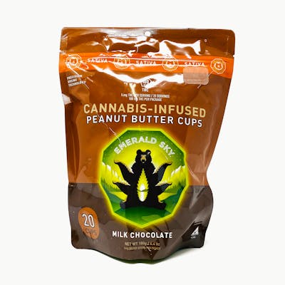 Need a sweet treat to take the edge off? Try Emerald Sky's delicious milk chocolate peanut butter cups -- infused with a tasteless sativa THC, they will give you a very uplifting high. Creamy and flavorful, each cup is individually wrapped. 10 servings per package. Each serving contains 10 mg of THC, using a proprietary dosing technology.