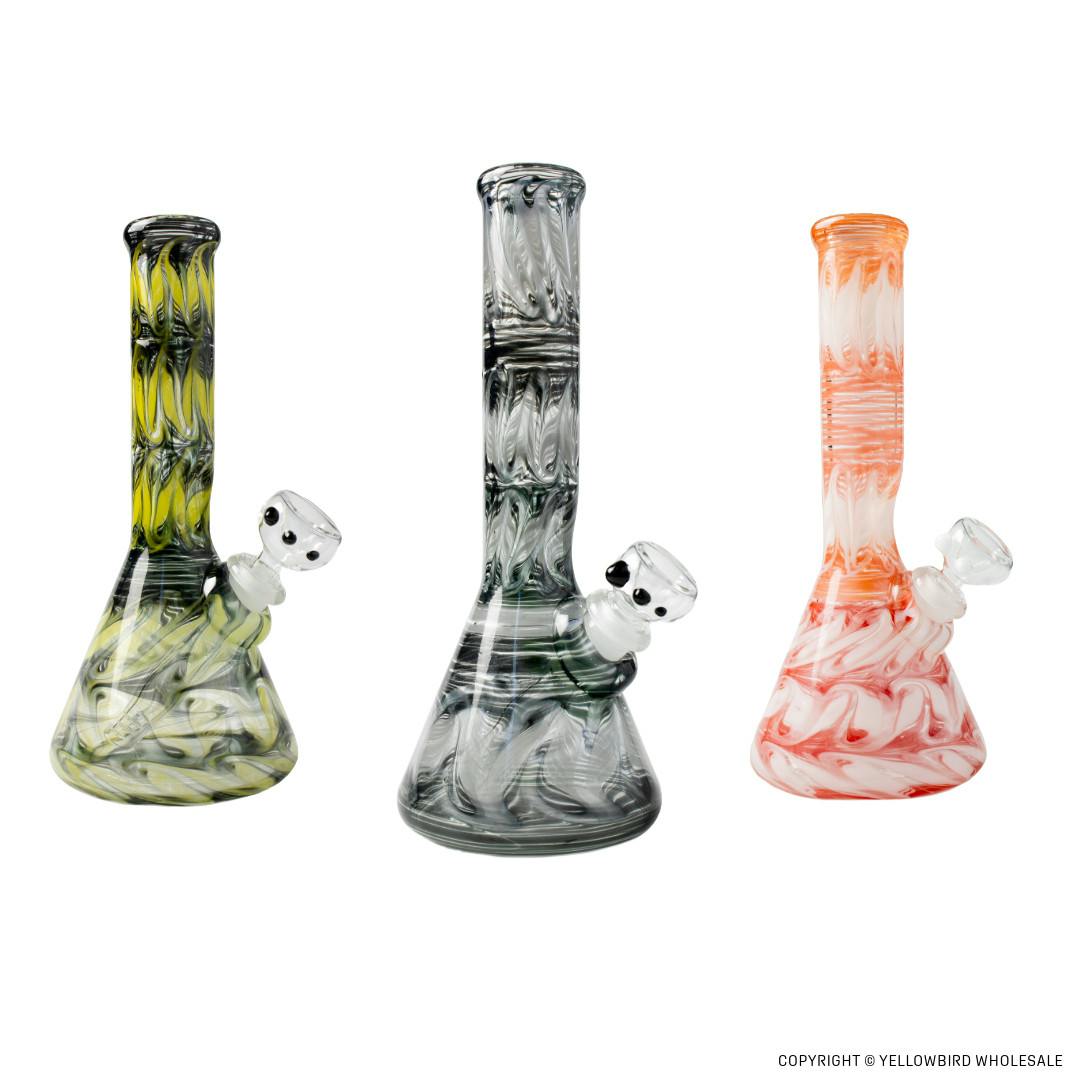 9” Locally blown in the PNW beaker with full 2 color wrap and rake beaker bottom. Made from German Schott tubbing and Northstar Glassworks color. 14mm