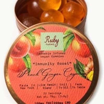 Ruby Farms - Cannabis Infused Vegan Gummies "Immunity Boost" - Peach Ginger Cayenne Crafted with the health-conscious in mind, these vegan gummies offer a unique fusion of taste and wellness. Infused with a premium Black Cherry Gelato live resin blend, each bite delivers a sophisticated combination of ripe peach sweetness, zesty ginger warmth, and a hint of spicy cayenne. These artisanal gummies aren’t just delicious—they’re packed with essential vitamins and nutrients, making them a perfect choice for those seeking both flavor and functional benefits. Designed to enhance relaxation and support an active lifestyle, they’re made with high-quality ingredients and ethically sourced cannabis. The Peach Ginger Cayenne flavor offers a delightful balance of sweet, spicy, and warm, while the cannabis extract provides a smooth, enjoyable effect. These gummies come in an easy-to-dose multi-pack, ensuring reliable and controlled intake. Since edibles are processed through the digestive system, it can take 45 minutes to 2 hours to feel the full effects. Always start low and slow, and keep edibles safely out of reach of children.