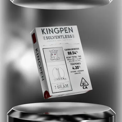 Gassy, sour lemon notes blend with creamy cookie sweetness for a rich, heavy-hitting solventless indica. Pure expression. No solvents. No shortcuts. Kingpen Solventless vapes feature 100% pure live rosin, extracted using only ice, water, heat, and pressure. This solventless process preserves peak terpene profiles and essential compounds, delivering the cleanest, most authentic expression of each cultivar. Crafted from small-batch, hand-selected flower, Kingpen Solventless offers unmatched aroma, flavor, and smooth vapor — exactly as the plant intended. This is cannabis at its most refined and most natural. Available in 510 cartridges and next-generation All-In-One hardware for the ultimate solventless experience.