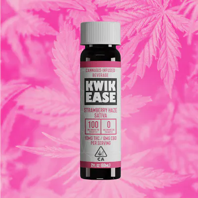 The newest addition to our Kwik Ease line, Kwik Ease Strawberry Haze Sativa packs the best parts of summer into a 2oz bottle. Blending real strawberries and fresh lemon juice with a sweet Strawberry Haze sativa, this strawberry lemonade gives you a graceful lift to elevate your summer enjoyment. -- 2 ounce beverage. -- 100 mg THC. Flavor: Strawberry Lemonade. Low calorie. Strain-specific with Strawberry Haze. -- Easy dosing - 5mg per capful. Water-soluble. In-house nano emulsion process. Fast-acting. -- Great to use for social or creative activities and outdoor enjoyment. -- Contains: CO2-extracted cannabis oil infused in water with honey, lemon juice, strawberry puree, ginger root, orange extracts, natural flavors, and citric acid.