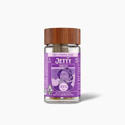 GDP x Purple Haze kicks off with Purple Haze’s heady, creative lift before GDP steps in with that classic NorCal couch-lock—earthy, berry-sweet, and perfectly unbothered from start to finish. Infused with Jetty High THC. Classic strains you know and love. High potency oil paired with premium small buds. Cryoinfused to preserve more terpenes, cannabinoids, and other natural plant compounds, giving you amazing flavor and a smooth smoke from start to finish. Top-shelf bud. Curated flower and oil pairings. Supercharged Potency. Find your flavor with Jetty Pre-Rolls.