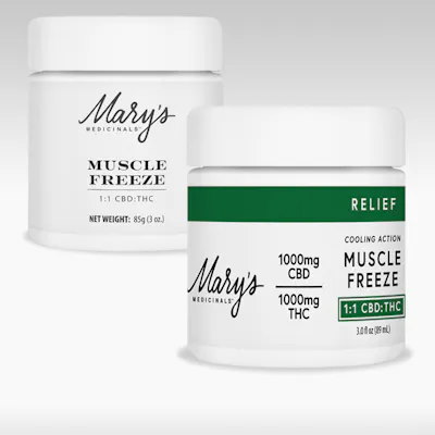 Doses: 1000 MG -- Say goodbye to unwanted aches and pains with Mary’s Muscle Freeze. The infused topical combines CBD, THC and other whole-plant nutrients to provide quick pain relief and a soothing, cooling effect.1000mg CBD:1000 mg THCOnset: Immediate – 15 minutes Duration: 3 – 5 hoursDosage: Apply as neededIngredients: Massage Oil (Sunflower Seed Oil, Canola Oil, Rice Bran Oil, Grapeseed Oil, Tocopherol), Massage Gel (Sunflower Seed Oil, Canola Seed Oil, Vegetable Oil, Apricot Oil, Avocado Oil, Jojoba Oil), Menthol, Beeswax, Emulsifying Wax, Isopropyl Myristate, Mango Butter, Camphor Oil, PlantaMulse (Sorbitan Laurate, Polyglyceryl-4 Laurate, Dilauryl Citrate), CBD, THC, Oleic Acid, Optiphen (Phenoxyethanol, Caprylyl Glycol), Marjoram Oil, Xanthan Gum.