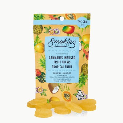 CBD: 0.16% | THC: 0.17% | THC9: 0.17% -- Smokiez THC:CBD 1:1 with 100mg THC and 100mg CBD - to help balance your high. Smokiez Sweet Tropical Chews are NOT YOUR AVERAGE FRUIT CHEWS™ These delicious fruit chews are a tasty and satisfying way for your customers to medicate! They are also Vegan, Gluten Free, Dairy-Free, and contain NO High Fructose Corn Syrup. Each of our mouth watering fruit chews contain 10 mg of THC and 10 mg of CBD, and made with our high clarity cannabis distillate for great taste. There are 10 pieces per package with 100 mg active THC and 100 mg active CBD per package. Available in both sweet & sour!