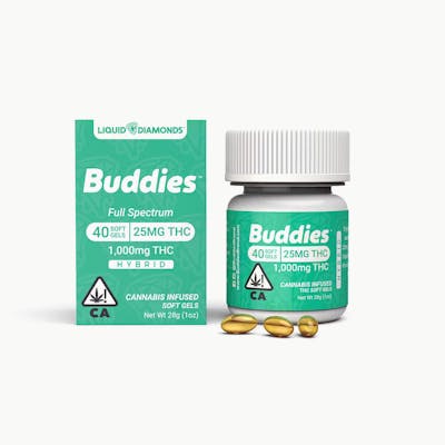 CBC: 0.77mg/g | CBG: 2.15mg/g | THC: 5.74% | THC9: 5.73% -- LIQUID LIVE RESIN SOFTGELS Experience Buddies’ high-quality Live Resin formula with maximum convenience with our pharmaceutical grade softgels. Available in bottle and trial sizes, each softgel captures a full spectrum of strain-specific cannabinoids and terpenes, providing a synergistic effect ideal to a well-rounded cannabis experience. Conceived to pair precise dosing with a discreet form, our softgels are perfect for any situation and ideal for those who prefer a method that’s familiar. Ingredients: Gelatin, Glycerine, MCT Oil, Cannabis Extract