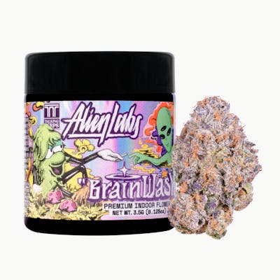 CBG: 0.79mg/g -- Your favorite celestial cultivators at Alien Labs met the deep forest dwellers at Talking Terps within an astral glade—Brainwash is the result of years of carefully considered deep tissue mind massages for your cerebral cortex. The smell places you in a spice market at noontime, seeking shade under the eaves of a hookah joint—herbal, sweet, citrusy, and minty in the slow swirl of heat. Densely enfolding verdant pyramids, tinted with purple, hide peaks and valleys with fractal dimension above 3.6 and spiritual dimensions only the 4th eye can comprehend. Spicy and buttery on pull, with a sweetness that sits on the tongue and gives way to herbal, earthy, slightly tangy notes on the exhale. A very potent hybrid—sedating, calming, and mind-wandering, without overwhelming distraction. Perfect for a Friday slide into the weekend or a mellow ramp up to a more charged evening outing.