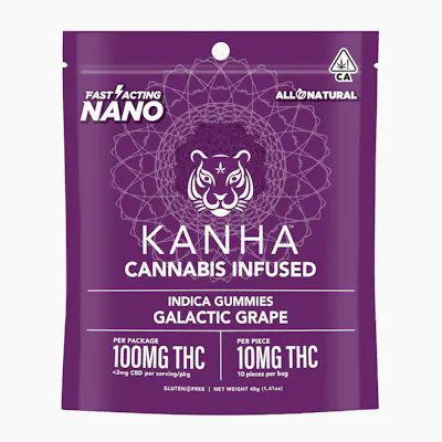Doses: 100 MG -- 10 pieces x 10mg/gummy = 100mg/bagWho needs wine when Galactic Grape Indica gummies deliver the flavor of harvest-ready grapes with reserve-worthy indica oil and terpenes like myrcene, a-humulene and ß-caryophyllene. Each soft and juicy gummy contains 10mg of THC and our exclusive NANO technology for faster takeoffs that send you into orbit in minutes. KANHA, the first to introduce fast-acting effects, remains the best with NANO gummies.