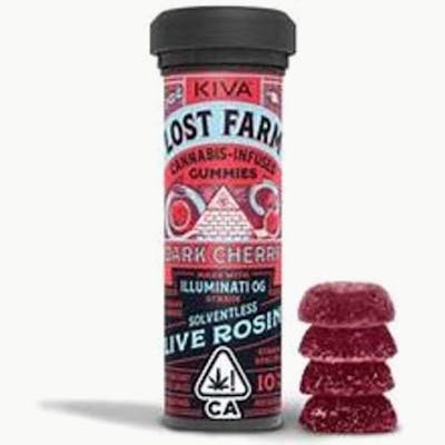 CBC: 0.03mg/g | CBG: 0.06mg/g | CBN: 0.01mg/g | THC9: 0.25% -- Indulge in the delectable delights of Dark Cherry Illuminati OG Live Rosin Gummies by Lost Farm. These scrumptious edibles offer a unique blend of flavors and effects that are perfect for anyone seeking a little extra relaxation and fun. Made with high-quality ingredients, these gummies are crafted to potentially help you unwind and unwind after a long day. With a hint of dark cherry flavor, these gummies provide a delicious treat that is sure to tantalize your taste buds. So sit back, relax, and enjoy the blissful experience of Dark Cherry Illuminati OG Live Rosin Gummies.