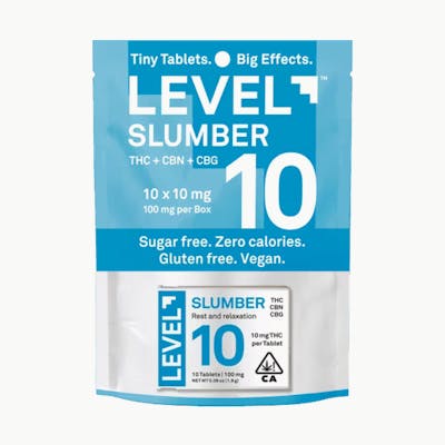 CBD: 0.03% | THC: 5.41% | THC9: 5.41% -- Struggling to find a natural and effective way to unwind and get a good night's sleep? Then forget sugary gummies and late-night snacks and try LEVEL 10 Slumber. We've combined the power of 10 mg of delta-9 THC, 5 mg of CBN, and 3 mg CBG in a carefully balanced formula designed to gently lull you into a state of relaxation and promote restful sleep. These highly effective, long-lasting tablets are sugar-free, gluten- free, vegan, and contain zero calories. They're scored for easy splitting so you can customize your dose to find the perfect level of tranquility. Simply swallow with liquid.