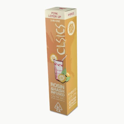 BetaCaryophyllene: 0.71% | Bisabolol: 0.15% | CBC: 0.28% | CBD: 0.24mg | CBDa: 0.23mg/g | CBDV: 0.02% | CBG: 1.26% | CBGA: 1.76% | CBN: 0.23% | Humulene: 0.25% | Limonene: 0.11% | Linalool: 0.06% | THC: 548mg | THC9: 262.8mg | THCA: 271mg/g | THCV: 0.07% -- TRIFECTAS are an extra dank, triple threat of rosin, hash and flower; a phat 1.2g preroll perfect for sharing and getting super stoned. All CLSICS rosin infused pre rolls are handcrafted from start to finish. These products begin with carefully curated strain specific cannabis which is then infused with our in house processed fresh frozen ice water hash rosin extracted from meticulously procured strains selected for their unique terpene profiles to deliver a delicious, mouthwatering connoisseur level solventless experience. Flower .8g: Pink Lemon Up Rosin .3g: Pink Lemon Up Hash .1g: Pink Lemon Up